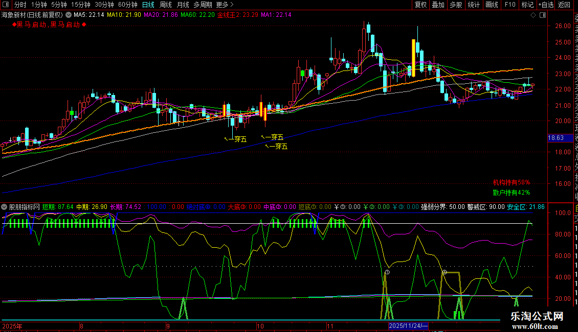 DRAWTEXT(选股,L*0.94,'↖一穿五'),COLORYELLOW;