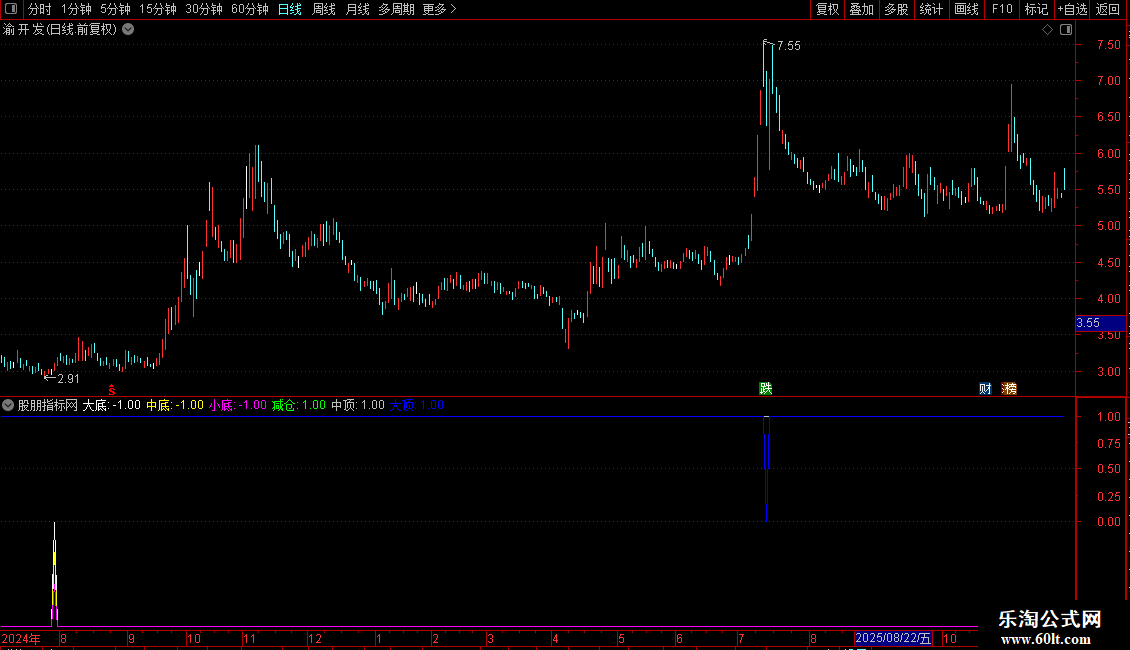 X:=MA(AMOUNT,5)/MA(V,5)/100; VAR3:=(X-MA(AMOUNT,125)/MA(V,125)/100)/X; VAR4:=MA((LLV(L,45)-C)/(HHV(H,45)-LLV(L,45))*100,3); VAR5:=C/MA(C,60)-1; 大底:IF(CROSS(-5,VAR4) AND VAR3<-0.4,-0.01,-1); 中底:IF(CROSS(-5,VAR4) AND VAR3<-0.25 AND VAR3>-0.4,-0.3,-1); 小底:IF(CROSS(-5,VAR4) AND VAR3<-0.15 AND VAR3>-0.25,-0.6,-1); 减仓:IF(CROSS(VAR4,-95) AND VAR5<0.2 AND VAR5>=0.1,0.6,1); 中顶:IF(CROSS(VAR4,-95) AND VAR5<0.35 AND VAR5>=0.2,0.3,1); 大顶:IF(CROSS(VAR4,-95) AND VAR5>=0.35,0,1);