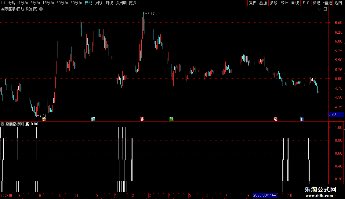 RSV1:=(CLOSE-LLV(LOW,21))/(HHV(HIGH,21)-LLV(LOW,21))*100; RSV2:=(CLOSE-LLV(LOW,37))/(HHV(HIGH,37)-LLV(LOW,37))*100; 短线:=SMA(SMA(RSV1,3,1),3,1)+3*STD(CLOSE,21),COLOR00FF00;中线:=SMA(RSV2,5,1)+2*STD(CLOSE,37),colorred; RSV3:=(CLOSE-LLV(LOW,55))/(HHV(HIGH,55)-LLV(LOW,55))*100; 长线:=SMA(RSV3,5,1),coloryellow; 中线2:=-100*(HHV(HIGH,40)-CLOSE)/(HHV(HIGH,40)-LLV(LOW,40));底: (CROSS(中线2,-90) AND (长线<中线 AND 长线>REF(长线,1)OR 短线<20 AND 中线<20 AND 长线<20))OR (CROSS(短线,长线)AND 长线<18 AND 长线>REF(长线,1)OR CROSS(长线,5));