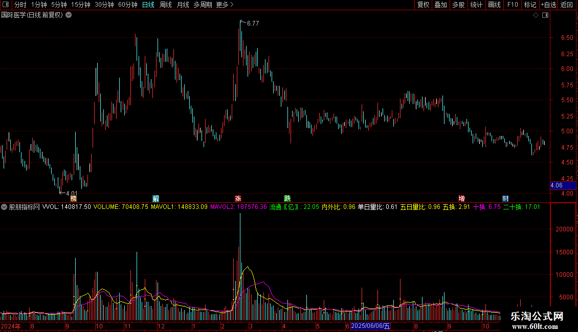 五日量比:V/(REF(MA(V,5),1)/240*FROMOPEN),COLORYELLOW,NODRAW;