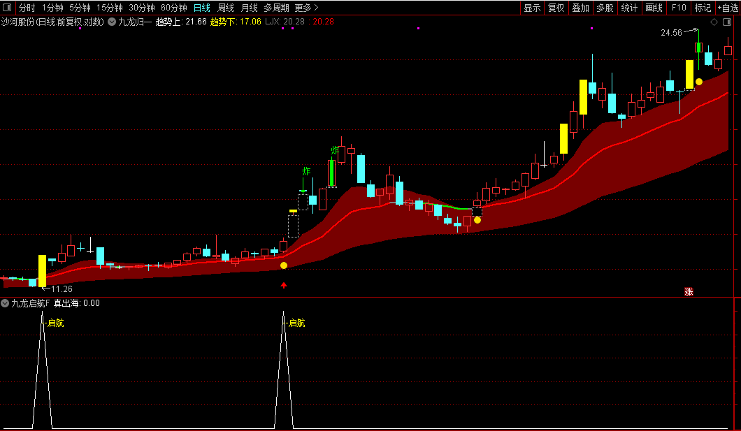 出现启航图标,且K线下方伴随倍量小黄点,是主力洗盘结束并放量启动的共振信号,可作为激进型介入参考。