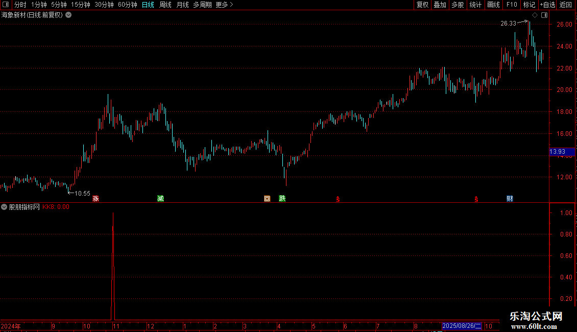 KK8:C<REF(C,1)*0.907 AND MA5>=REF(MA5,1) AND MA1>MA2 AND (H<REF(O,1) OR H<=REF(C,1)),COLORRED;