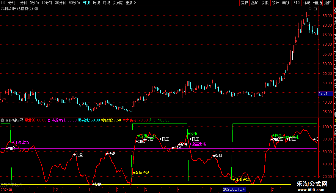 DRAWTEXT(CROSS(主力资金,警戒线) AND 方向 < 50,主力资金,'★洗盘') ,COLORWHITE;