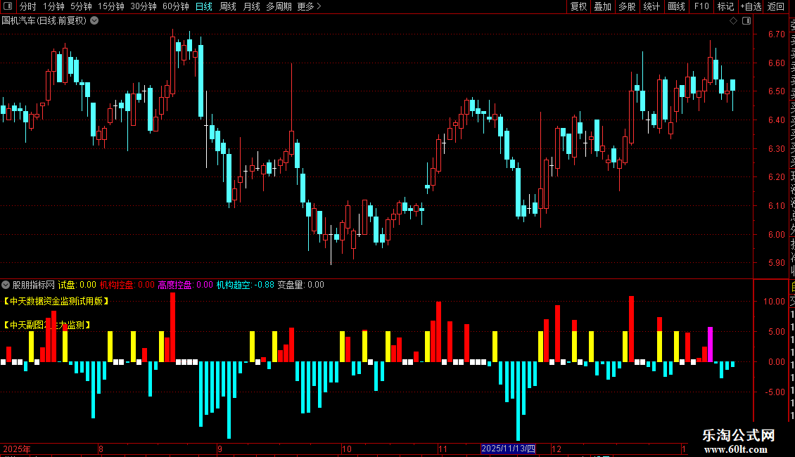 指标主要用于监测主力资金对个股的控盘状态和操作动向。通过双重平滑价格计算出“控盘”力度,结合筹码分布与成本数据,识别主力是否在吸筹、高度控盘、试盘或开始出货。当控盘由负转正时视为试盘信号;持续上升且处于正值区域,代表机构积极介入;若控盘虽为正但开始回落,则提示可能在派发筹码;而控盘为负则反映主力离场或做空意愿。此外,还通过筹码集中度辅助判断控盘强度,并标出变盘过渡期。