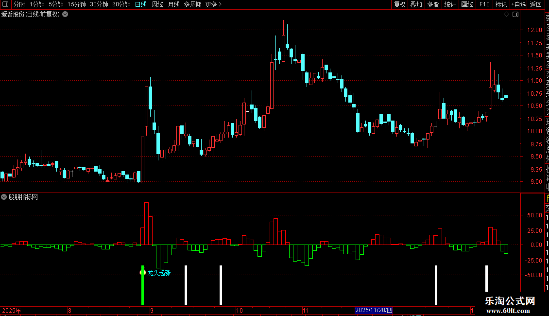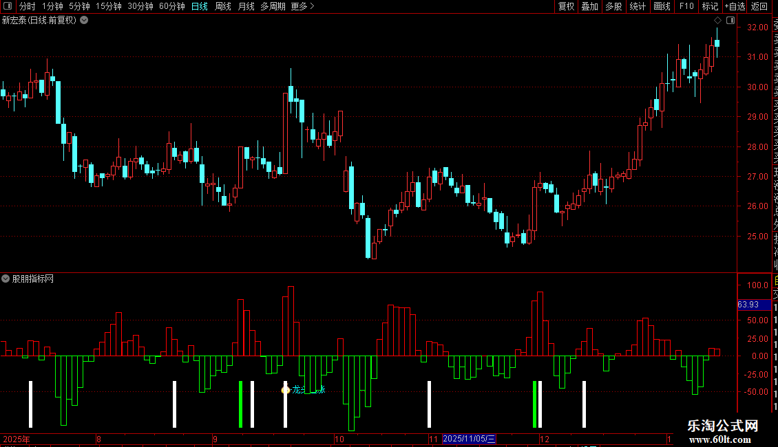指标主要用于捕捉股价阶段性底部和强势启动信号。通过价格位置、短期动能、量能变化及多类技术指标融合,识别两类关键机会:一是长期下跌后出现的“见底预期”,二是放量突破伴随资金进场的“龙头起涨”信号。当多个条件共振时,系统会以不同颜色的柱状图和文字提示操作时机,辅助判断低吸或追涨点。