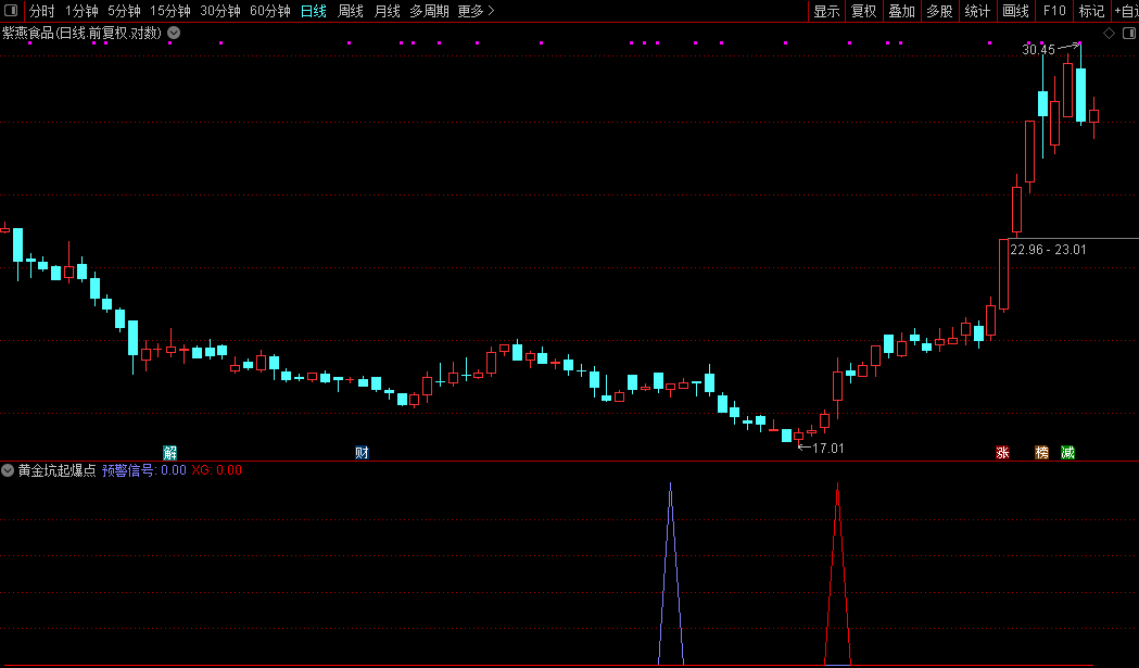 本公式旨在识别股价经过短期调整后,即将启动新一轮上涨的潜在转折点,即所谓的“黄金坑”形态。