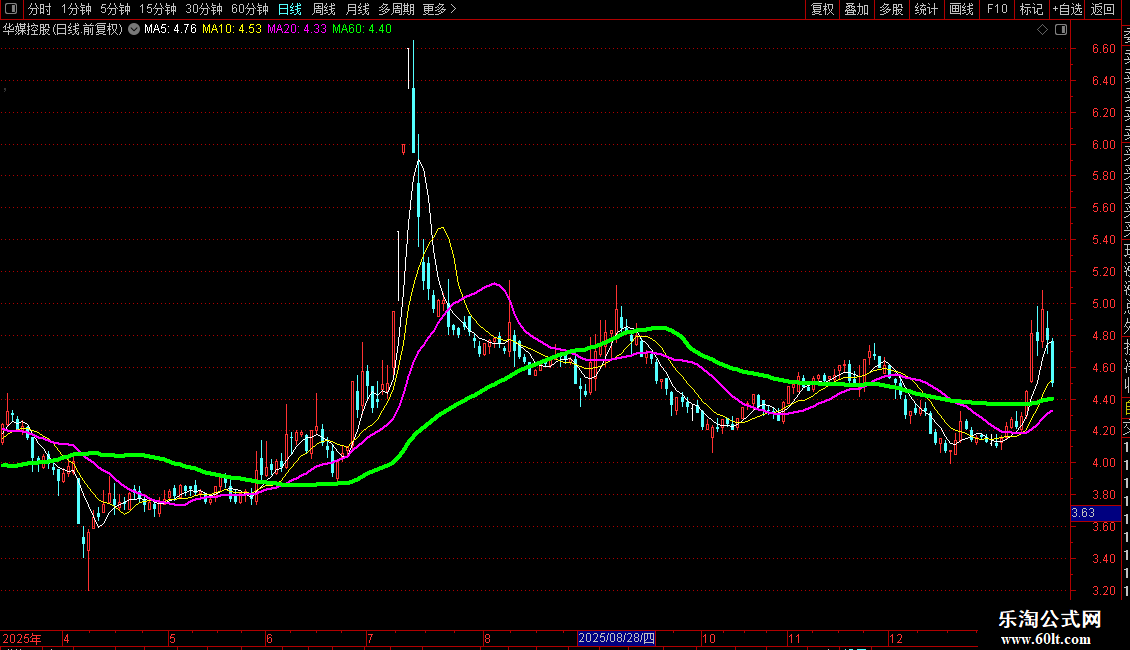 5 当四条均线紧密粘合时,常为大黑马启动前兆。此时应密切留意盘面。一旦出现放量长阳突破绿色和紫色趋势线,表明主力开始拉升,应及时跟进布局。