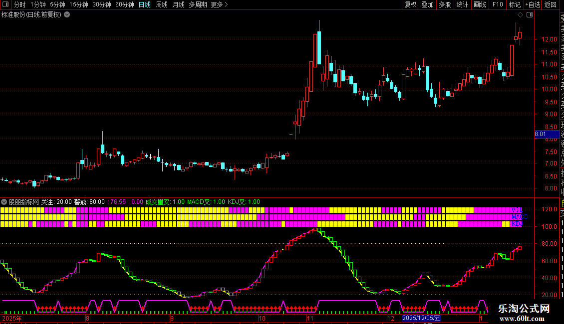 指标融合价格波段、成交量、MACD和KDJ三大信号,通过颜色与柱状图直观展示多空状态。主波段线反映价格在近期高低区间中的相对位置,并用红绿柱区分涨跌动能;同时在高位区和低位区设置警戒与关注线,辅助判断极端情绪。下方三个模块分别显示量能、趋势和超买超卖状态,三者同步向上时视为强势信号,反之则偏弱。操作上可结合多个模块共振作为买卖依据。