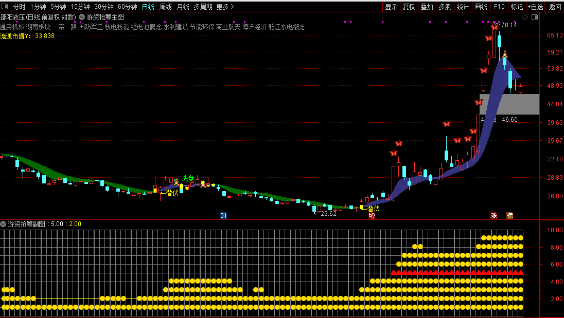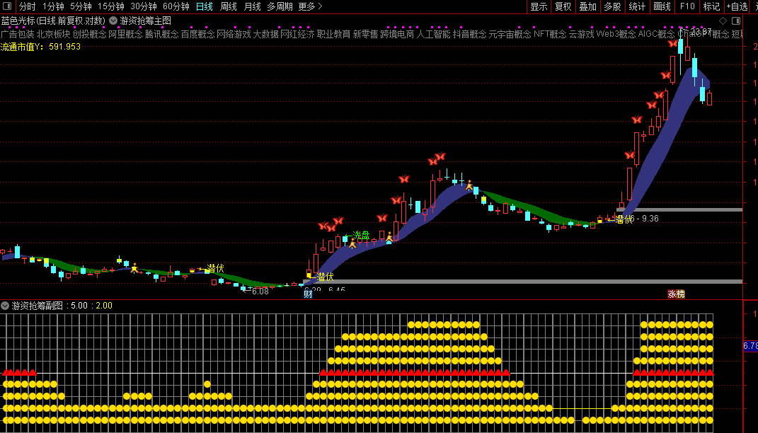 2. 副图作为市场情绪与资金热度辅助判断工具,共振图标越多、位置越高,表明游资抢筹意愿越强;