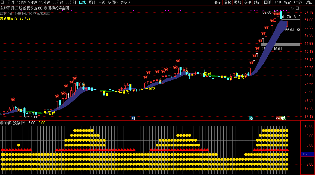 配套副图游资抢筹F指标通过价格波动率叠加多重均线通道突破评分机制,以0至10分位图标直观展示资金抢筹强度。当个股涨幅达标且评分较高时,副图将密集显示抢筹图标,提示游资活跃,与主图信号形成强共振。