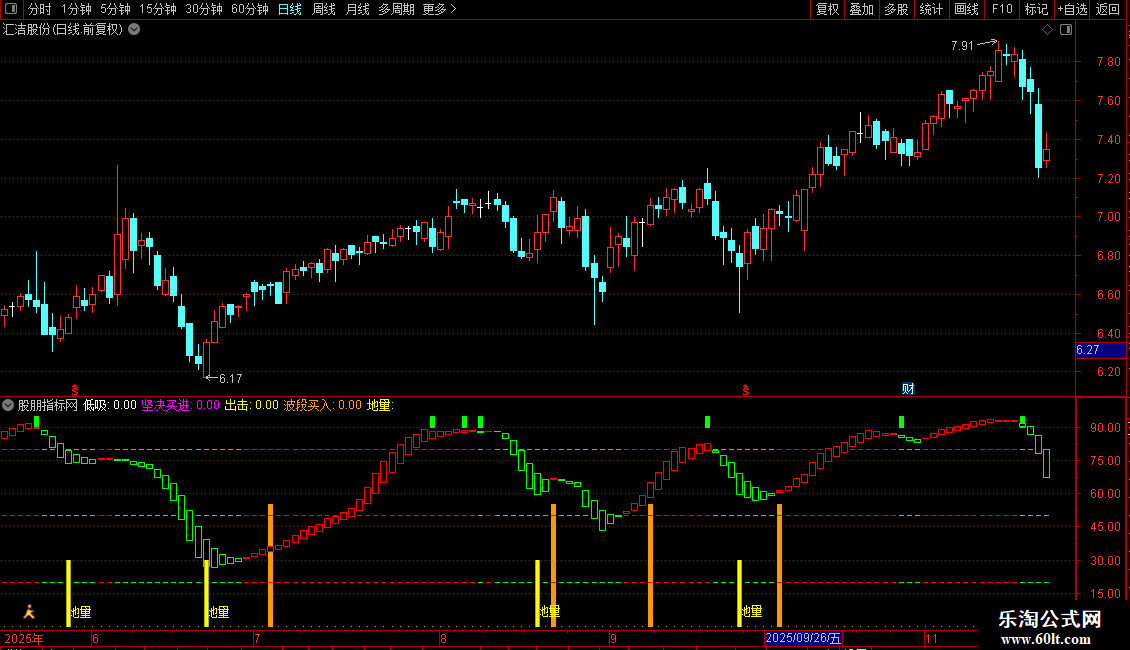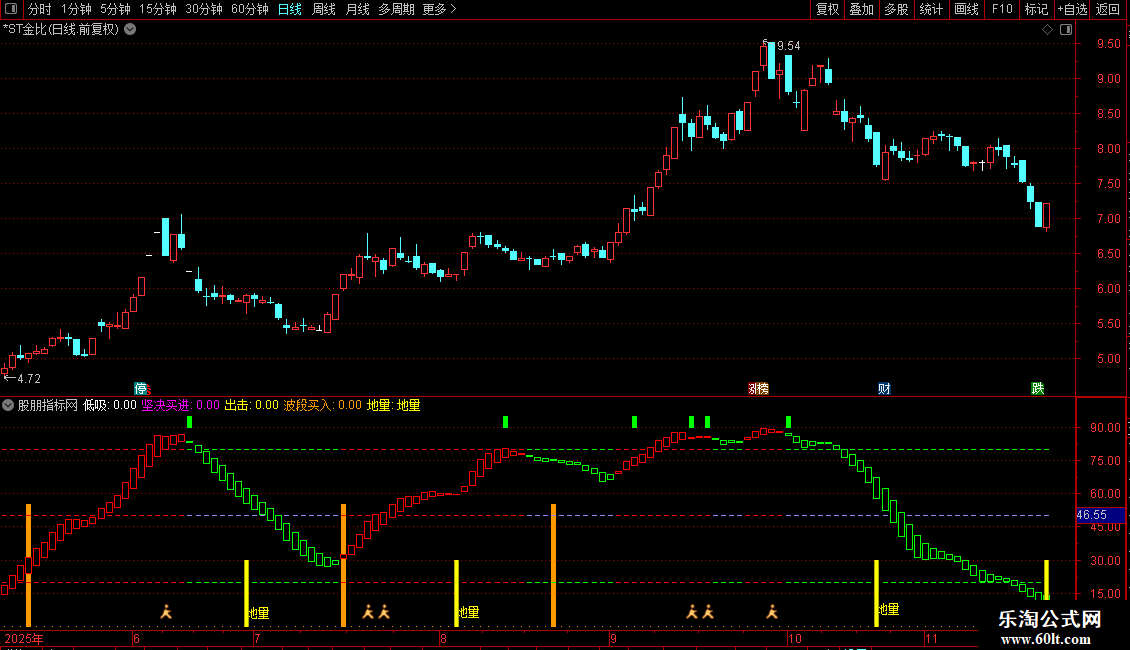 地量:DRAWTEXT(CROSS(0.9,1/VOL*1000>0.01 AND J<0),L*1,'地量'),COLOR00FFFF;