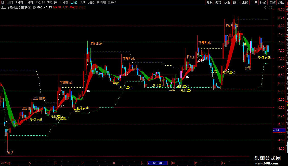 翻云擒龙EQ是一款融合量价突破、均线趋势、RSI、KDJ等多维度指标的操盘公式,核心围绕量价关系构建涨停模型,通过8/12/13日均线斜率、波段趋势线、超跌超买区间等信号,精准识别股价强弱。公式用彩色K线区分多空(红涨绿跌),叠加压力/支撑位虚线,同时标注“涨停启动”“见底”“顶部形成”等关键信号,还通过不同颜色柱体标识股价阶段高低点,直观呈现多空博弈格局。