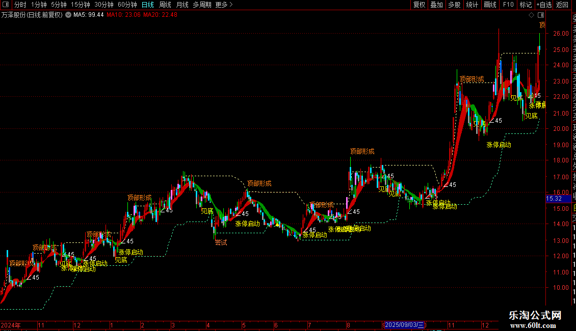 1. 看多信号:出现“涨停启动”“见底”“∠45”提示,且趋势线上穿0轴、KDJ的J值低位金叉时,是低吸布局时机;
