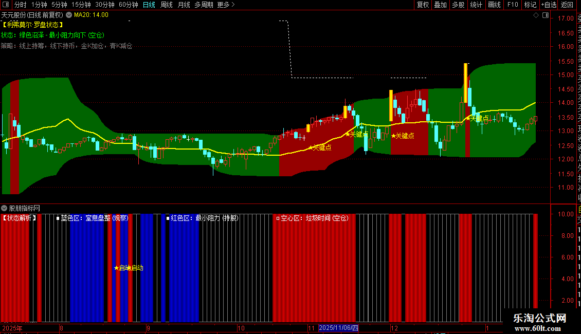 功能:独创的色块指标。蓝色代表“蓄势(盯盘)”,红色代表“主升(持股)”,灰色代表“垃圾时间(休息)”。