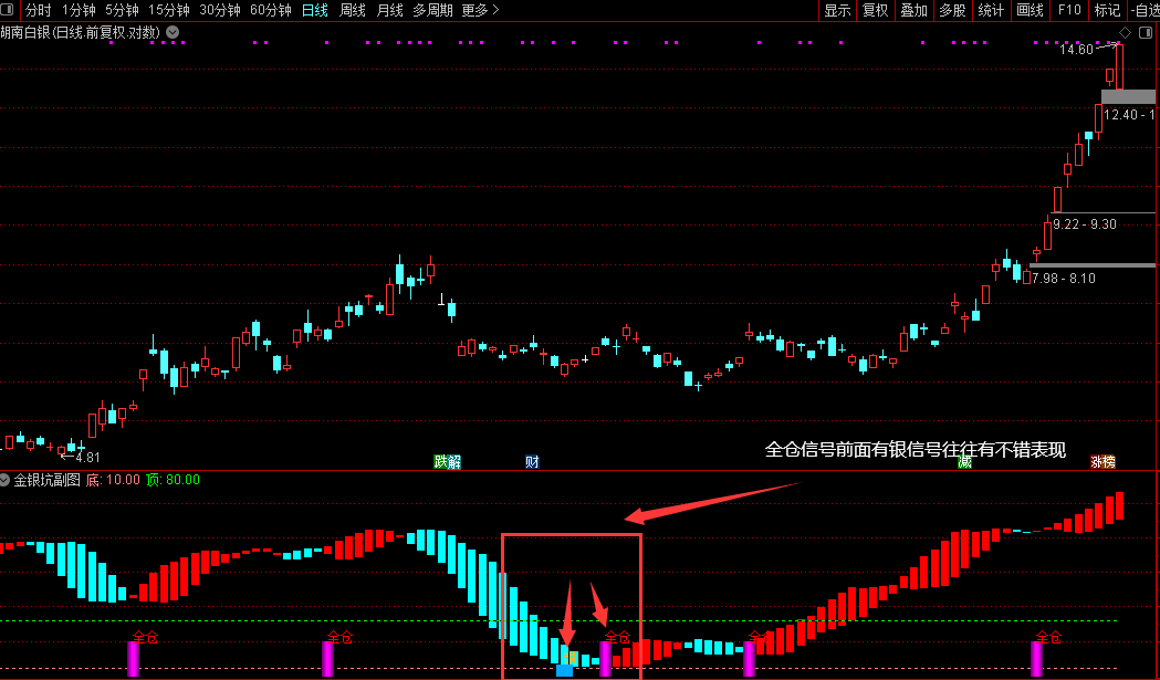 本指标“金银坑”包含1幅副图及选股功能,旨在辅助识别市场底部的三类机会信号。其核心通过结合短期动能与价格偏离度,划分出白银、黄金、钻石三种底部强度等级:当快慢线形成金叉且偏离值达到不同阈值时,分别触发对应级别的信号,并以不同颜色柱体直观标注于副图,同时标注“银”“金”等文字提示。指标还设有红绿柱状线用以展示中期趋势强度,并标注固定超买超卖参考区域,整体帮助使用者更清晰地把握价格低位转折的潜在时机,尤其适用于捕捉下跌后的反弹或反转节点。当出现“全仓”信号前几日若已有“银”信号出现,往往后续行情表现较为可观。