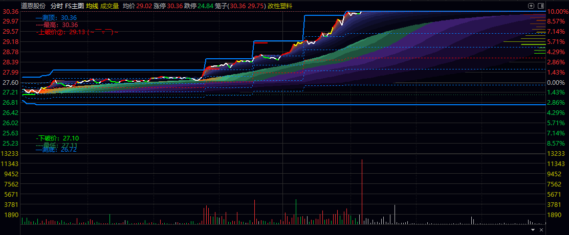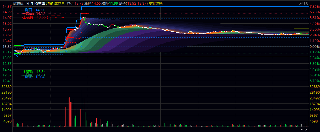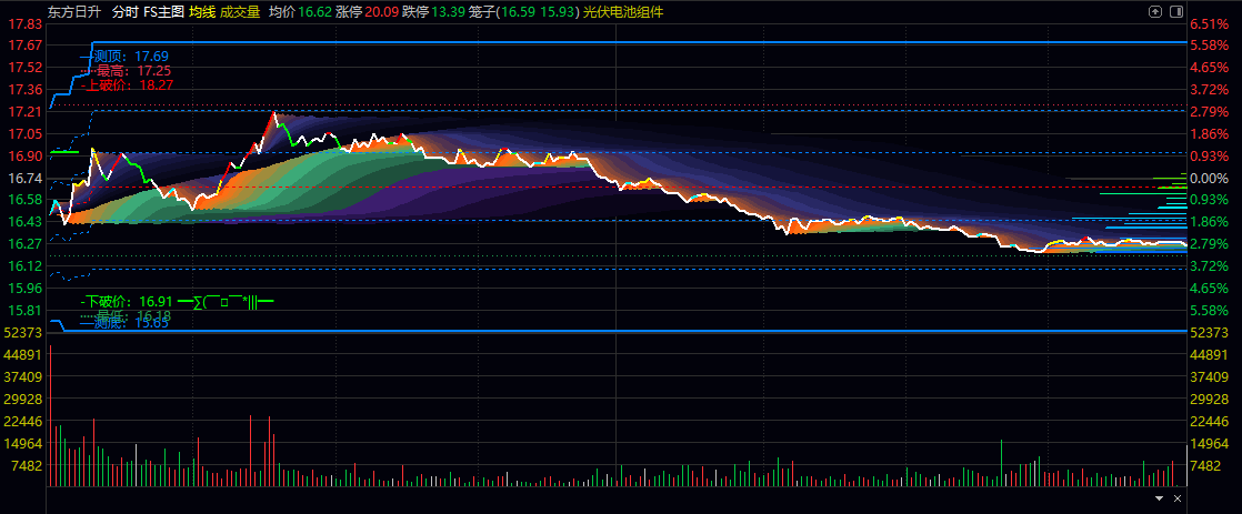 本指标为分时图分析工具,核心功能是动态预测日内可能的高点与低点位置。它通过多阶递推算法,结合价格波动与市场成本结构,逐级测算潜在的支撑与阻力区间。指标以五色渐变波段直观展示不同周期下的价格强弱分布,同时通过彩色K线及分时走势颜色区分市场状态(如上涨、洗盘、下跌等)。在分时界面中,会实时标注预测的顶部、底部及中间位,并辅以斐波那契扩展线和多层动态预警线,帮助观察价格突破与转折信号。使用时只需加载至分时图,系统即自动计算并显示关键价位与层级轨道。