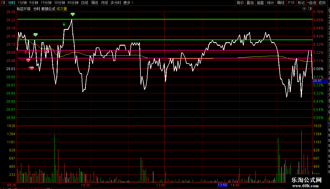 在分时主图中,红色向上箭头代表潜在的低吸机会临近,提示投资者可关注买入时机;绿色向下箭头则表示高抛机会出现,适合考虑止盈或减仓。当出现红色钻石信号时,视为明确的入场信号;而绿色钻石则作为出场信号,提示及时离场锁定收益。