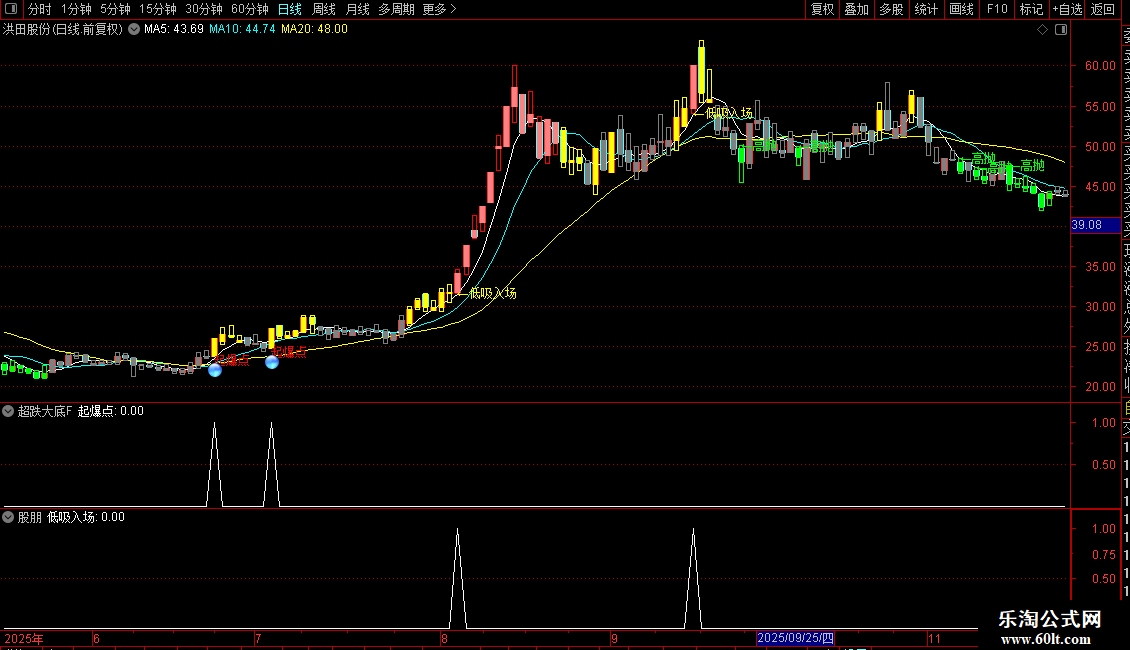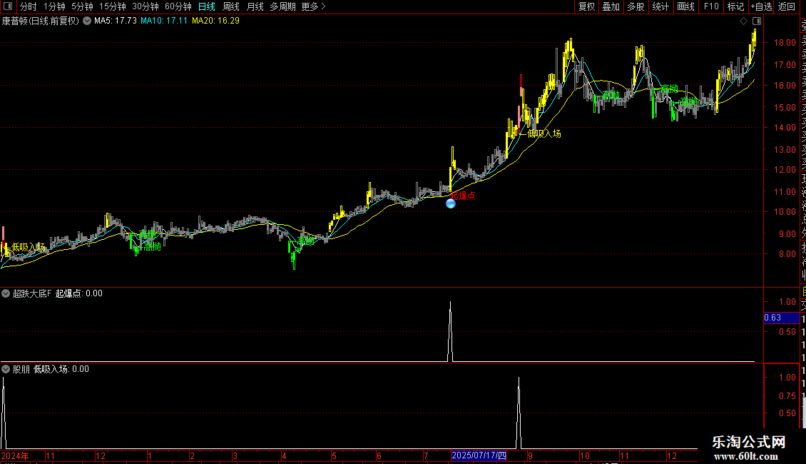 指标通过多条均线与价格区间划分,将市场状态分为五个等级,并用不同颜色的K线直观显示当前所处位置:低位、震荡、高位等。结合成交量、价格突破和短期动量信号,在特定条件组合下提示“低吸入场”“高抛”或“主力拉升”等操作时机。另设“起爆点”信号,用于捕捉放量突破关键压力位且接近涨停的强势启动行情。