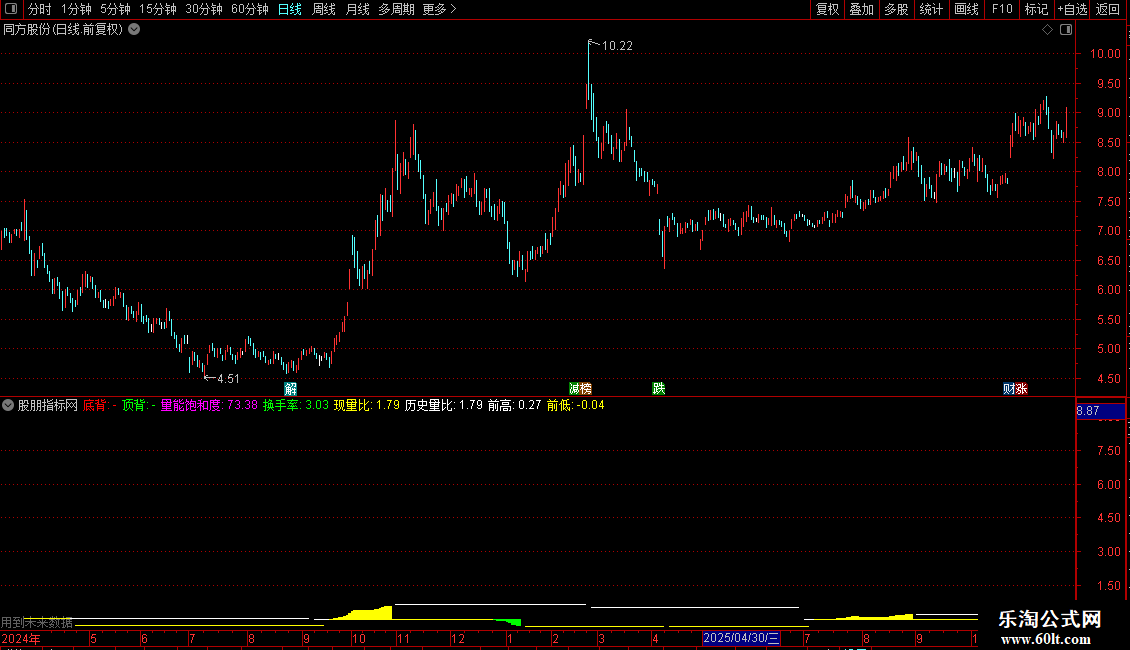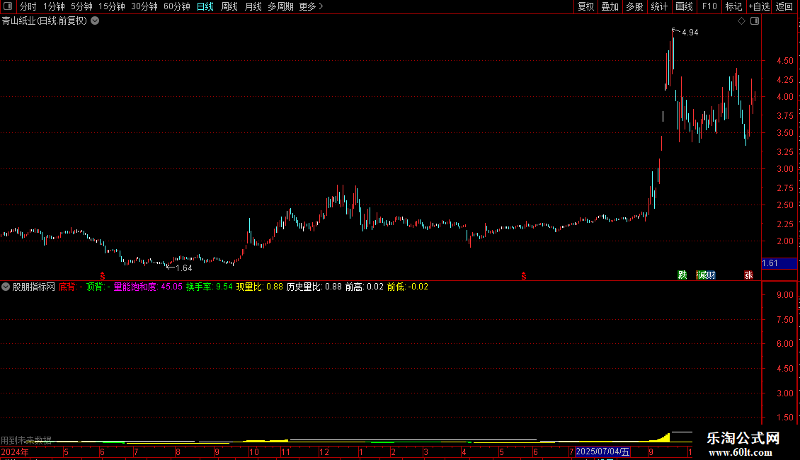 量能饱和度:IF((AMOUNT/C)/(HHV(AMOUNT,20)/HHV(C,20))*100>100,100,(AMOUNT/C)/(HHV(AMOUNT,20)/HHV(C,20))*100),NODRAW;