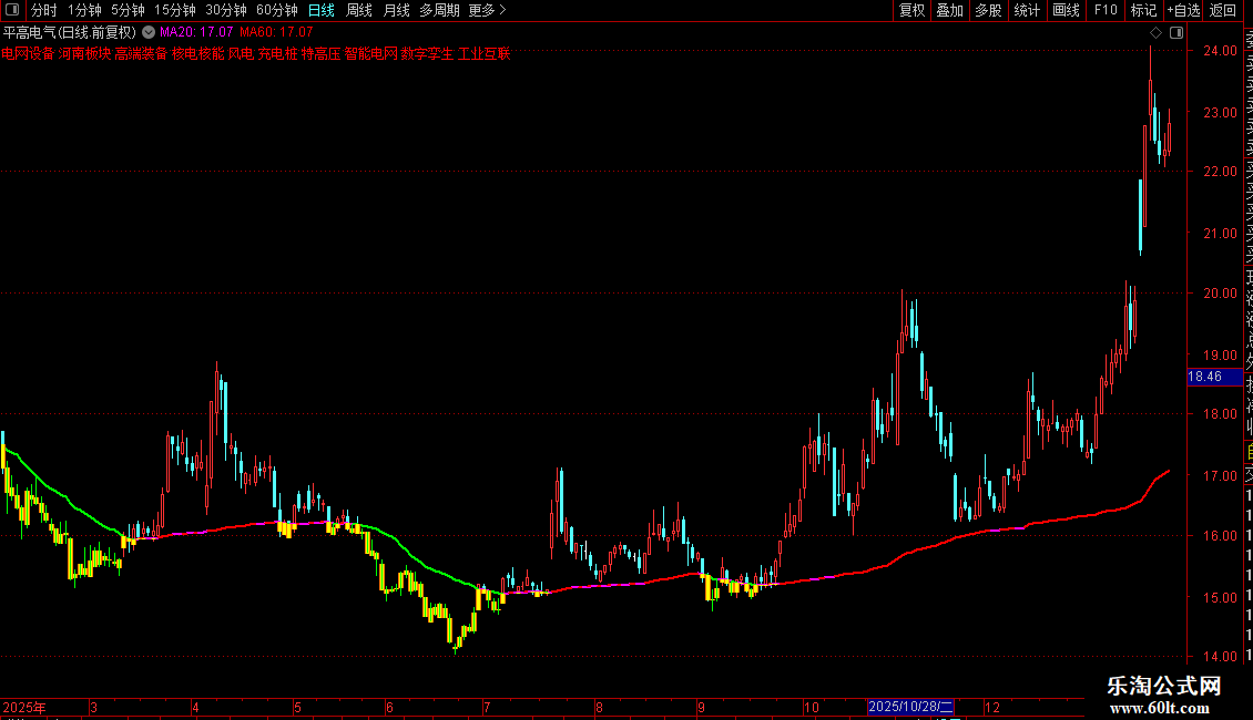 STICKLINE(成本价>LOW AND 成本价< HIGH,成本价,MIN(MIN(OPEN,HG0),成本价),1.2,0)*HG4,COLOR00DDFF;