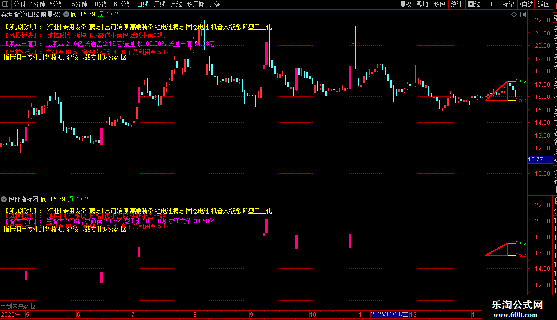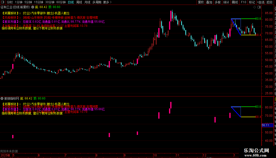 指标主要功能是整合个股所属行业、概念、地域及风格板块信息,并展示关键财务数据(如总股本、流通盘、市盈率、净资产收益率、主营利润率等),帮助投资者快速了解公司基本面。同时,通过识别龙虎榜资金动向和涨停信号,提示短期交易机会。此外,还构建了高低点结构分析系统,自动标记近期关键支撑与压力位,并在价格突破前高时发出买入信号。