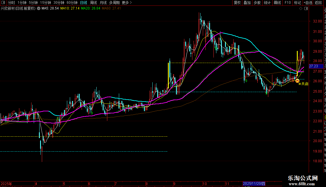 起爆信号:股价上穿“起爆线”时,以青色K线特别标注,指示趋势加速。