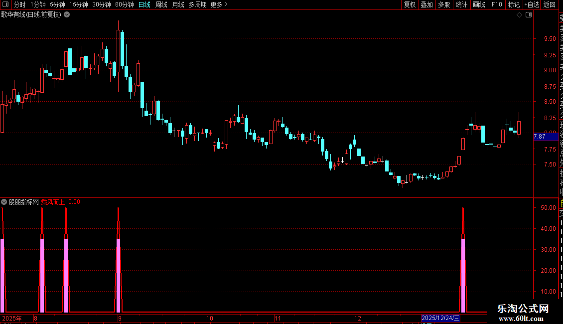 1. 指标副图中出现蓝色柱状(数值50)、粉色柱体叠加黄色“★乘风而上”图标时,为明确买入信号,代表个股符合上升趋势且短线启动条件;