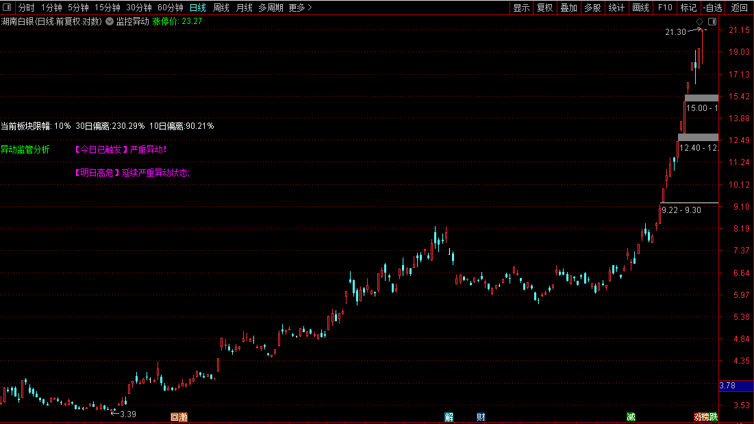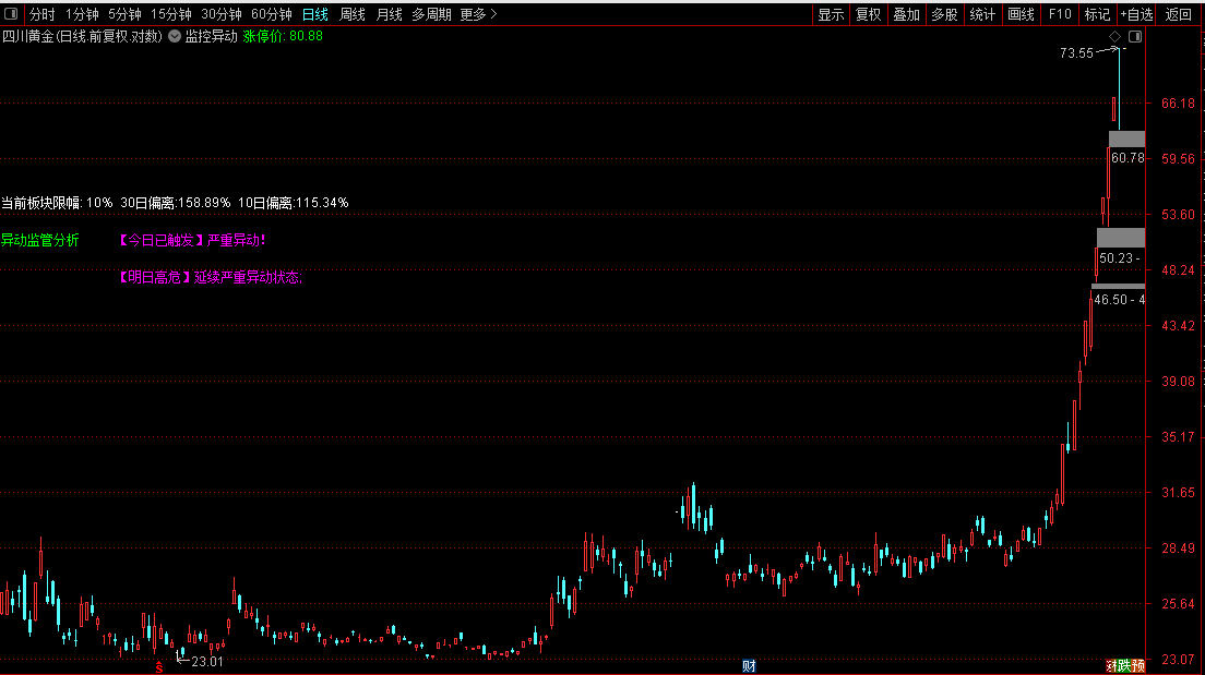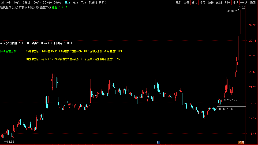 在K线主图上显示今日或者明天是否触发“监控异动”,只显示两日内是否有触发异动。专门用于在股票日K线图上实时监控和预警交易异动风险。其核心功能是依据监管规则,自动识别不同板块(如主板、创业板、科创板、北交所)的涨跌幅限制,并动态计算个股相对于对应基准指数的价格偏离值。界面会醒目提示“异动监管分析”,并分别列出“今日”和“明日”的风险状态。根据计算结果,会以不同颜色文字给出从“安全”到“已触发严重异动”等多种状态提示,明确告知用户当前股价位置是否面临监管异动风险、触发条件所需的剩余涨幅,以及次日的风险预判,帮助投资者有效管理交易合规风险。