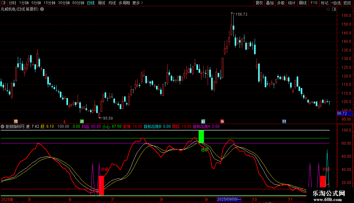 目标出现A:IF((COUNT((股神>REF(股神,1)),1)=1) AND (REF(股神,1)<REF(REF(股神,1),1)) AND (股神<跟踪),50,0),COLORF00FF0;