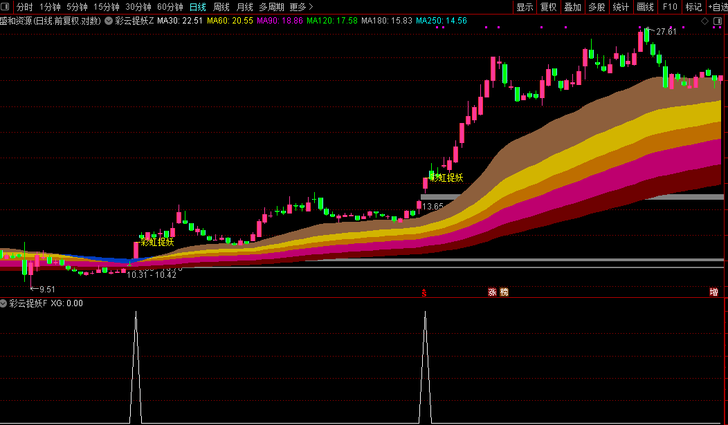 通达信【彩云捉妖】主副/选股八条不同周期的均线构出多层带状区显现多空强弱源码