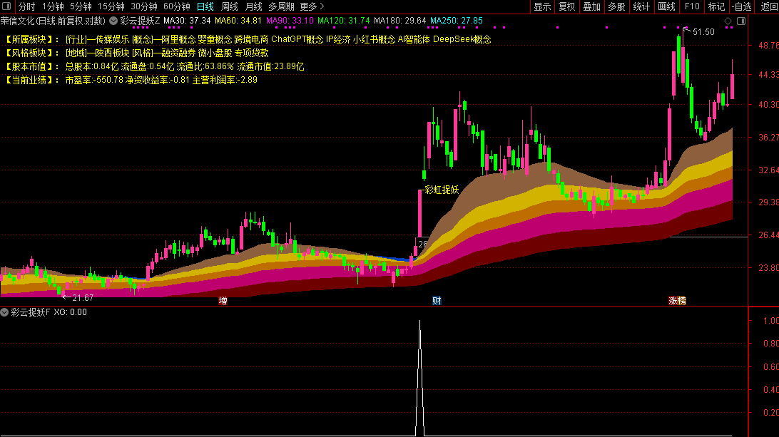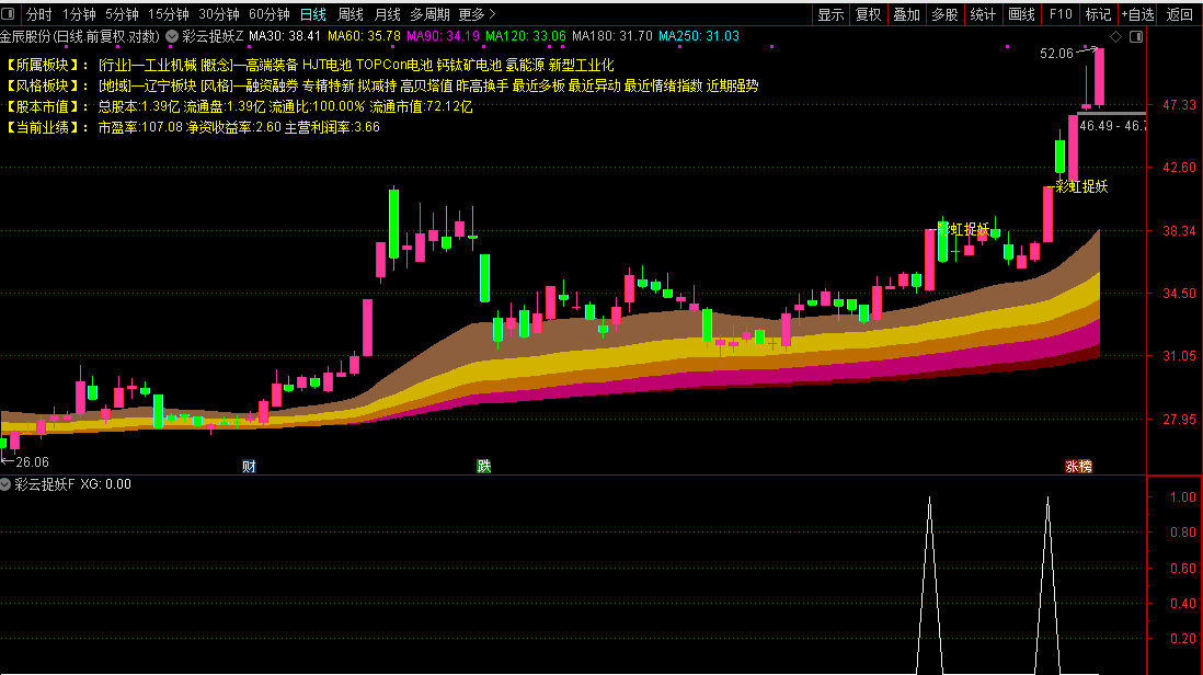 在主图部分,该指标通过八条不同周期的均线构建出多层带状区域,以颜色渐变直观呈现股价的多空强弱分布与趋势结构。同时,它整合了所属行业、概念、地域等板块信息,并实时展示股本、流通市值、市盈率及收益率等基本面数据,帮助投资者在技术分析中同步掌握个股背景与财务概况。