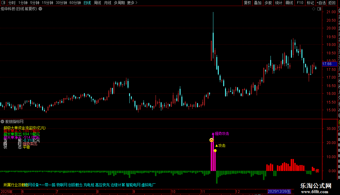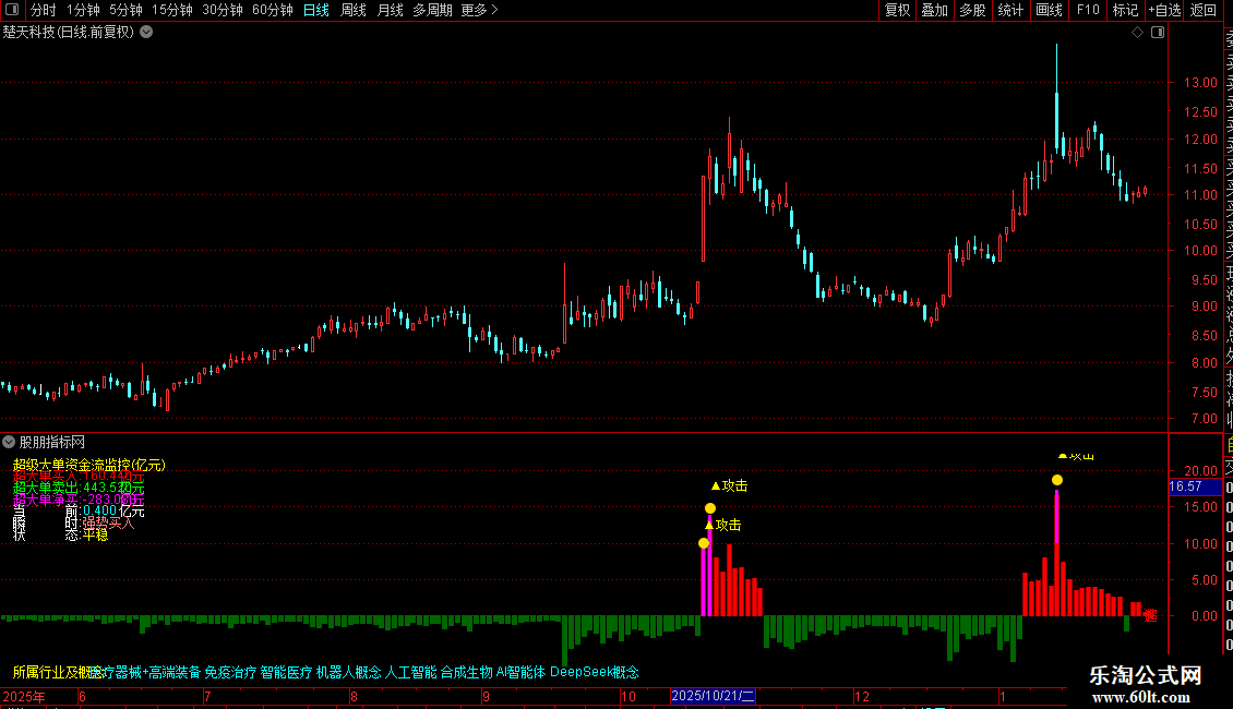 指标主要用于实时监控市场中超级大单资金的流向与活跃程度,通过识别大额成交是否伴随价格上涨,判断主力资金是积极进场还是出逃。它不仅统计累计净流入/流出金额,还结合近期量能基准,评估当前资金动作是否异常,并据此划分攻击强度和资金状态。图表上用不同颜色柱体直观显示买卖力度,同时标注“强势攻击”“连续流入”等关键信号,辅助判断短期多空动能。