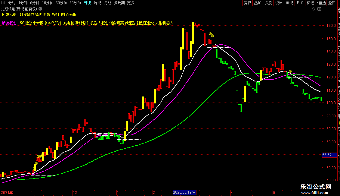 中线成本:EMA(X,13),LINETHICK2,COLORFF00FF;