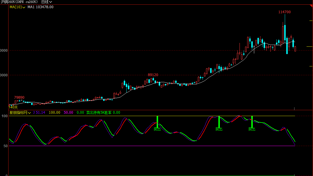 LOWV:=EMA(LLV(LOW,34),3);HIGHV:=EMA(HHV(HIGH,34),3);RSV:=EMA((CLOSE-LOWV)/(HIGHV-LOWV)*100,3);K:=SMA(RSV,8,1);D:=SMA(K,6,1);J:3*K-2*D,RGB(128,0,255);J1:=MA(J,3);PARTLINE1(J1>REF(J1,1),J1),COLORRED,LINETHICK2;PARTLINE1(J1< REF(J1,1),J1),COLORGREEN,LINETHICK2;A1:=BARSLAST(REF(CROSS(J,J1),1));DBL:=REF(CLOSE,A1+1)>CLOSE AND J>REF(J,A1+1) AND CROSS(J,J1) AND J< 20;STICKLINE(DBL,0,25,COLORMAGENTA,0);KTEXT(DBL>0,0,30,1,COLORWHITE,'买进');A2:=BARSLAST(REF(CROSS(J1,J),1));SBL:=REF(CLOSE,A2+1)< CLOSE AND REF(J1,A2+1)>J1 AND CROSS(J1,J) AND J>80;KTEXT(SBL>0,0,75,1,COLORGREEN,'卖出');STICKLINE(SBL,100,80,COLORGREEN,0);DWJC:=CROSS(J,J1) AND J<=0 AND J1<=0;STICKLINE(DWJC,0,25,COLORRED,0);KTEXT(DWJC,0,30,1,COLORWHITE,'M');GWSC:=CROSS(J1,J) AND J>=100 AND J1>=100;STICKLINE(GWSC,100,80,COLORGREEN,0);KTEXT(GWSC,0,75,1,COLORWHITE,'M');100;50;0;XG1:=DBL>0;NN:=BARSLAST(DATE< >REF(DATE,1) )+1;C1:=VALUEWHEN(DATE< >REF(DATE,1),REF(NN,1));X_1:= BARSCOUNT(C);X_2:=C1*29+NN;X_:=IF(X_1>X_2,X_2,X_1);ZBGS1:=BARSLAST(BARSLAST(XG1)=5);ZBGS2:=BARSLAST(FILTER(XG1,5));ZBGS3:=CROSS(ZBGS2< ZBGS1,0.5),COLORRED;ZBGS4:=CROSS(ZBGS2>ZBGS1,0.5),COLORGREEN;ZBGS5:=IF(ZBGS4=1 AND C>REF(C,5),1,0);ZBGS6:=SUM(ZBGS5,X_);ZBGS7:=SUM(IF(ZBGS4=1 ,1,0),X_);买进持有5K胜率:ZBGS6/ZBGS7*100,NODRAW,COLORRED;XA_1:=SBL>0;XA_2:=BARSCOUNT(C);XA_3:=C1*29+NN;XA_4:=IF(XA_2>XA_3,XA_3,XA_2);XA_5:=BARSLAST(BARSLAST(XA_1)=5);XA_6:=BARSLAST(FILTER(XA_1,5));XA_7:=CROSS(XA_6< XA_5,0.5),COLORRED;XA_8:=CROSS(XA_6>XA_5,0.5),COLORGREEN;XA_9:=IF(XA_8=1 AND C< REF(C,5),1,0);XA_10:=SUM(XA_9,XA_4);XA_11:=SUM(IF(XA_8=1 ,1,0),XA_4);卖出持有5K胜率:XA_10/XA_11*100,NODRAW,COLORGREEN;