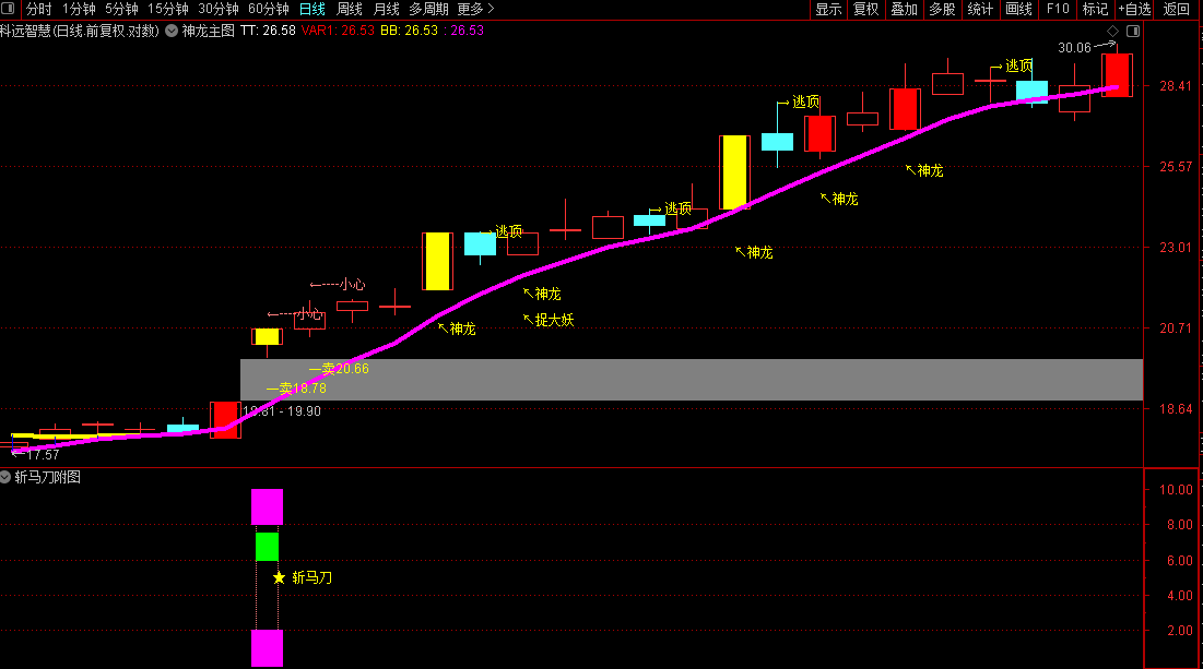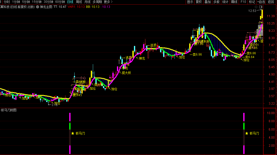 1、本公式包含:【神龙主图】+【斩马刀副】和【斩马刀选】抓妖股主升浪。