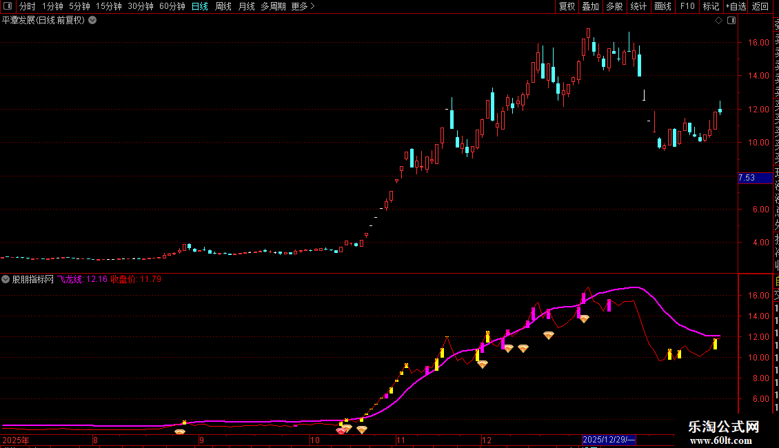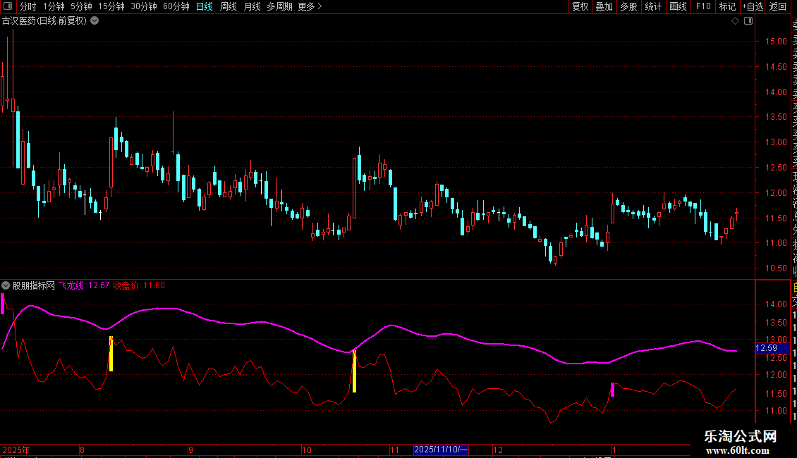 指标通过多条均线组合判断股价强势突破信号。首先构建一条基于短期指数均线的“飞龙线”,当股价上穿该线时提示潜在买点;其次,系统同时监测多个不同周期的均线,若当日开盘价低于多数均线而收盘价站上,则视为多头共振;再结合放量大涨、光头阳线等特征,筛选出高动能上涨K线,并用图标和彩色柱体突出显示。整体策略聚焦于捕捉短期强势启动或加速上涨的个股。