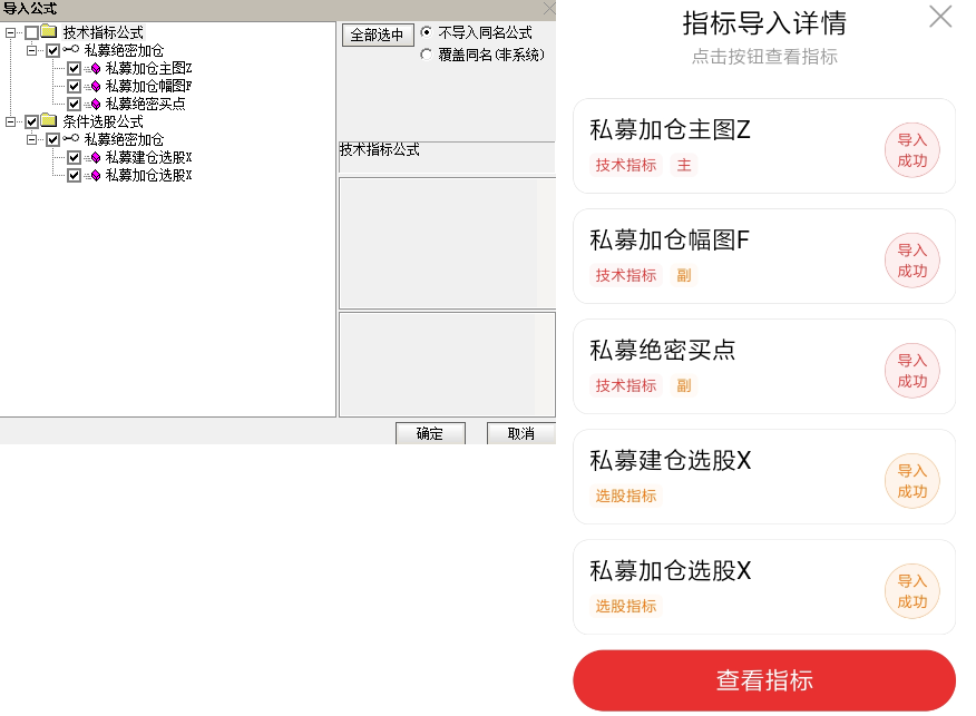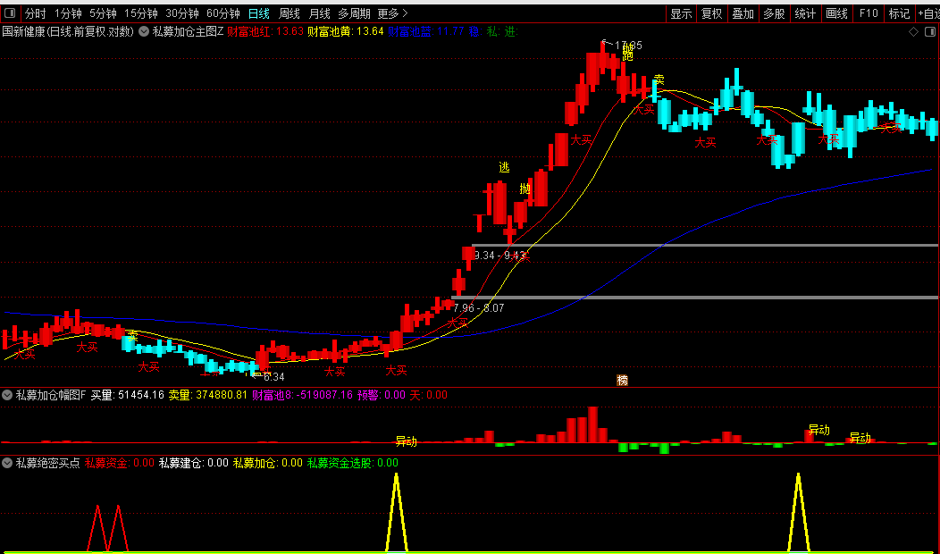 私募绝密买点副图:一个副图指标,用于在下方副图区域显示“私募资金”、“私募建仓”、“私募加仓”三个核心信号。