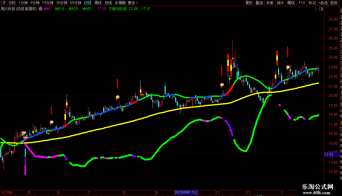 分道关注:IF(ZBGS350>=ZBGS358 AND 牛熊分道<=ZBGS358 AND ZBGS358<=REF(ZBGS358,1),ZBGS358,DRAWNULL),COLORMAGENTA,LINETHICK6;