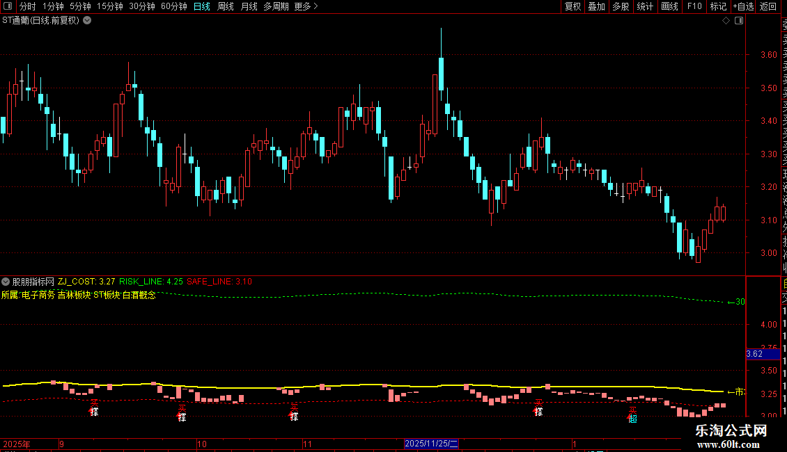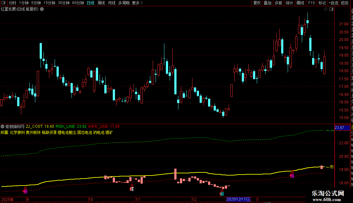 K线颜色:浅红色K线表示收盘价低于市场成本(C < ZJ_COST),属于“潜伏区”;正常颜色表示高于成本,属于“获利区”。