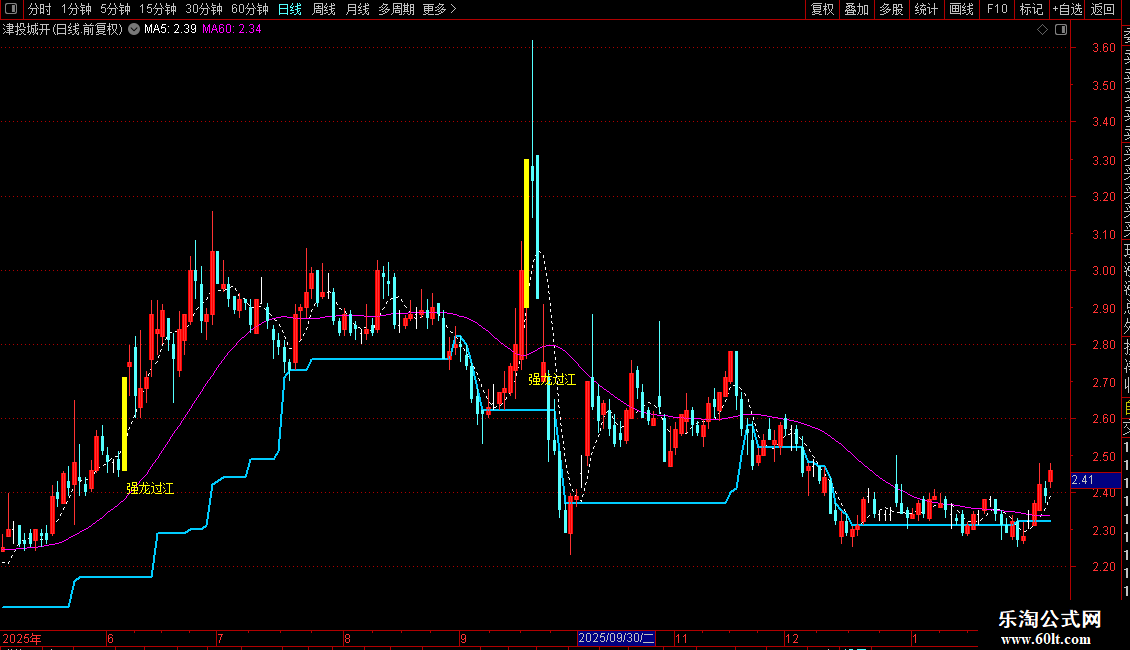 1 强龙过江主图指标中 白色虚线代表短线5日线 紫色线代表主力成本线 青色线代表短期成本线 当白色5日虚线上穿紫色主力成本线时 表示短线走强 是重要的股票技术分析信号