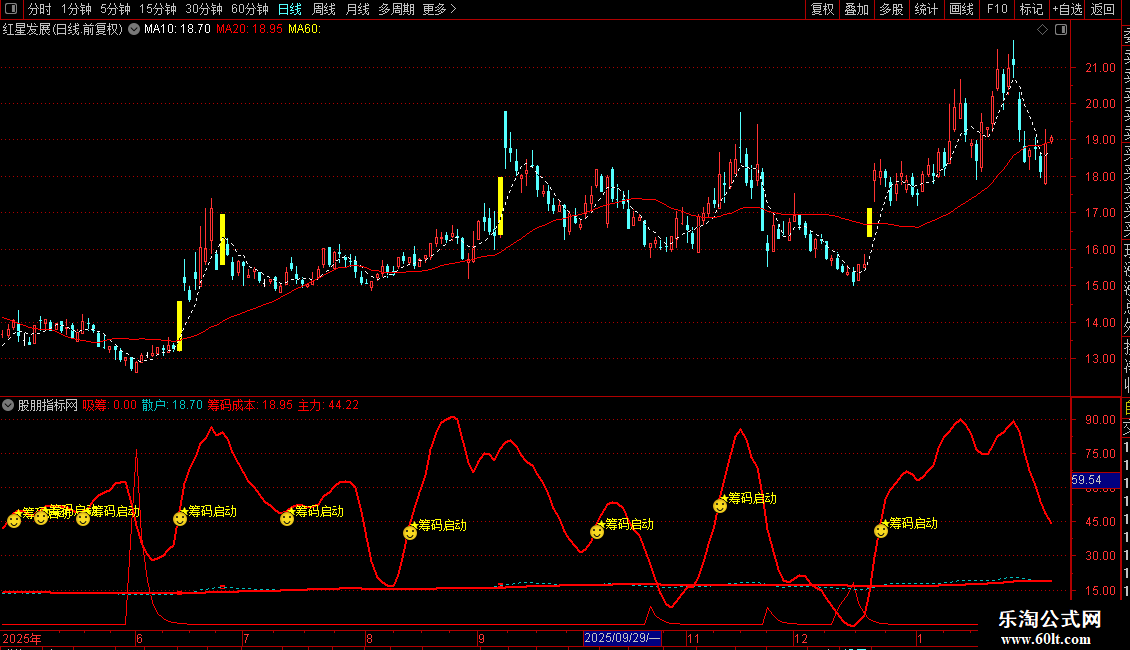副图融合RSI、KDJ优化算法与筹码吸筹能量柱,红色柱体越长代表主力吸筹越积极,并在主力线金叉散户线时发出“★筹码启动”信号。