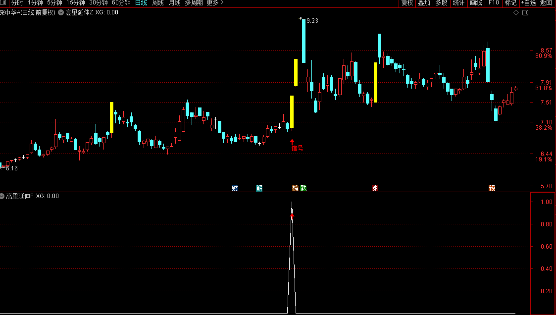寻找当日收出阳线且涨幅超过1%(涨停为最佳)的K线,该K线需同时满足两个条件——一是成交量为前后十日内最大,二是对应价格为同期最高价,形成高量高点。随后若股价进入缩量回调洗盘阶段,当价格再次向上突破该高量K线的最高价时,即视为洗盘结束、新一轮上涨启动的信号。这一高量延伸战法逻辑清晰,在牛市和熊市中均具备较强适用性。