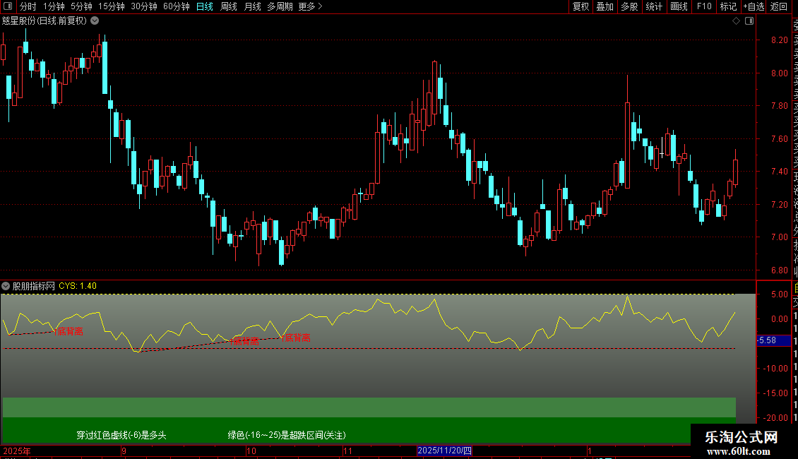DRAWTEXT_FIX(C>0,0.1,0.90,0,'穿过红色虚线(-6)是多头'),COLORWHITE;
