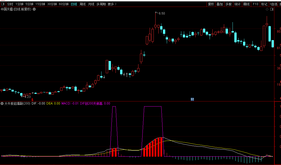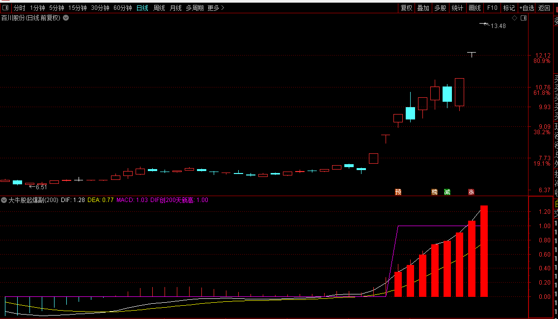 指标基于MACD原理,通过快慢指数移动平均线的差值构建DIF线,并对其平滑处理得到DEA线,再计算两者差幅形成MACD柱状图。核心功能是识别DIF线创出近期高点的强势信号:当DIF达到过去一段时间内的最高水平时,在图表上标记图标并以红色柱状线突出显示,提示可能的趋势加速或突破机会。