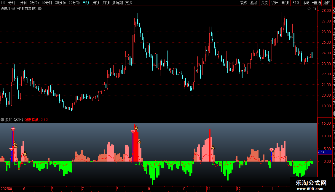 DRAWICON((REF(强度指数,1)-强度指数)>=1.5 AND 强度指数>0,0,2);