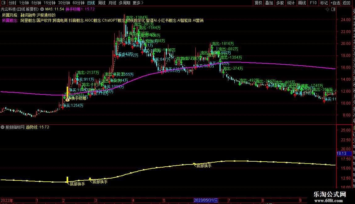主图通过成交量与价格结构精细计算“净流入”,当净买超300万且涨幅≥4%时发出醒目标记,并叠加独创的“换手吸筹线”,一旦股价放量突破该线并涨停,即视为主力启动信号。