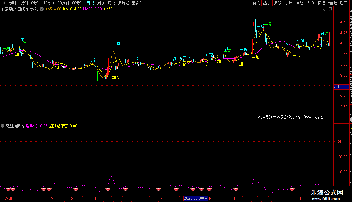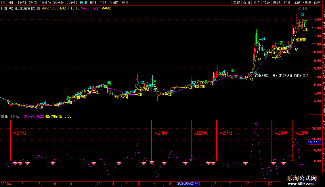 1. 主图公式:加载后显示5日、10日、30日均线,并自动标注“加”“减”“买入”“清”等文字提示。当出现“超预期”信号时,表明股票可能进入加速阶段,可重点关注。