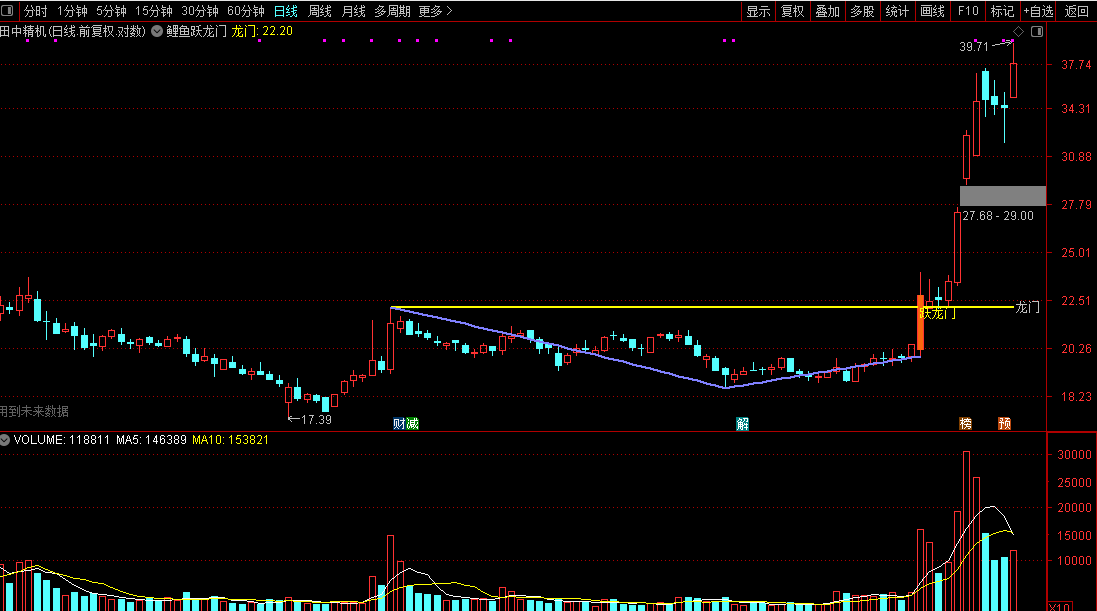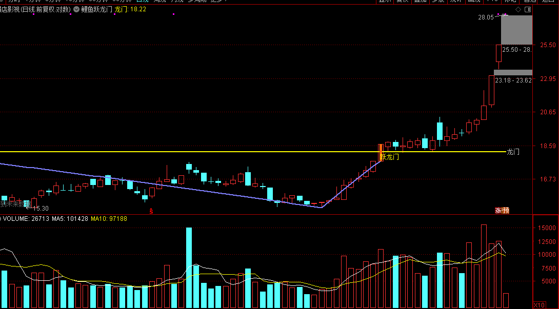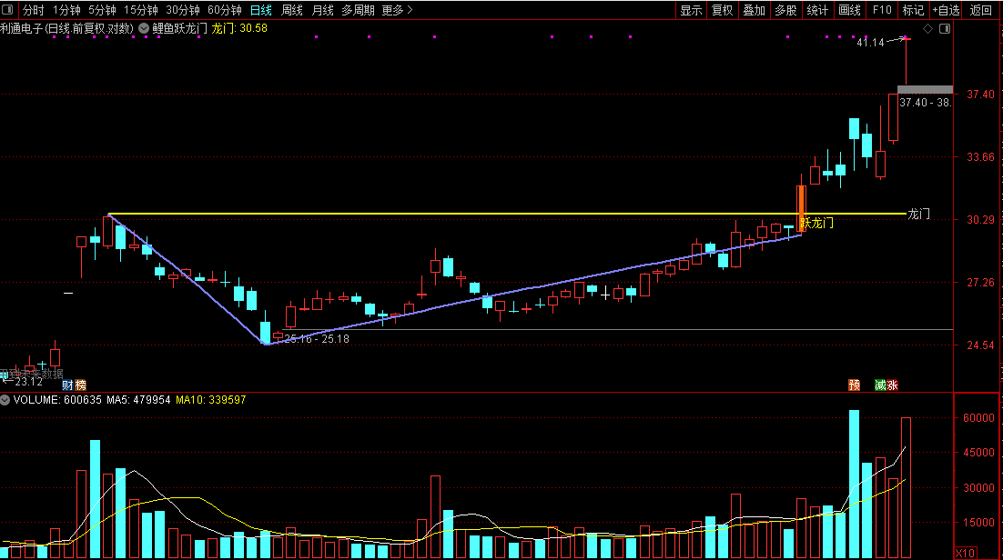 突破的时候,会标注跃龙门字样提示,同时k线颜色也是画出不同颜色用以区分,在三个月高点位置画出黄色水平压力线,同时在高点和地点之间,用折线连接;