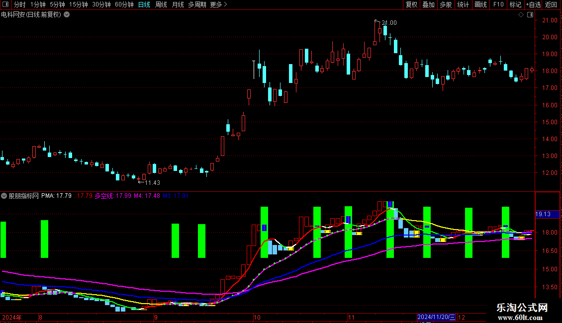 多空线:(20*X+19*REF(X,1)+18*REF(X,2)+17*REF(X,3)+16*REF(X,4)+15*REF(X,5)+14*REF(X,6)