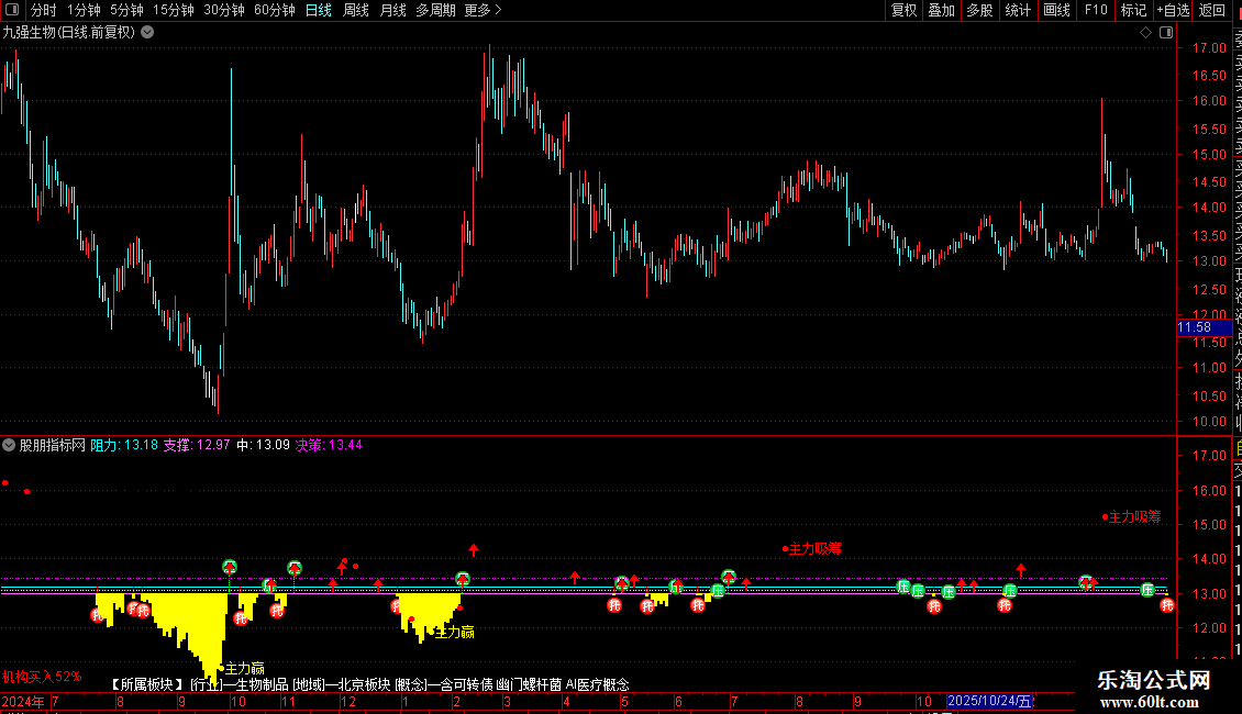 分时主力吸筹是一款适配通达信的分时主图指标,核心围绕资金动向与价格支撑阻力展开分析。指标先通过当日开盘价、最高价、最低价等数据计算出阻力位、支撑位和中位线,直观展示价格运行区间;同时拆分不同量级成交额的买卖情况,实时统计机构买入/卖出占比并标注在界面,还附带个股所属行业、地域、概念板块信息。
